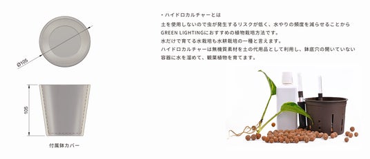 また、鉢カバーは底穴のない構造なので、土を使わない「ハイドロカルチャー」にも使えます。