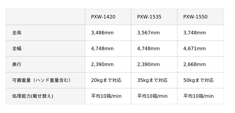PXW-1420(可搬重量:20Kg) PXW-1535 (可搬重量:35Kg) PXW-1550 (可搬重量:50Kg)