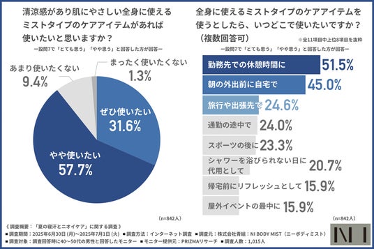 さらに、「シャワーが浴びられないときの代替ケア」として、全身に使えるミストタイプのアイテムに対しては、9割近い人が「使いたい」と回答しています。清涼感やベタつかない使用感など、夏場の不快感を軽減し、気分をリセットできることが期待されているようです。