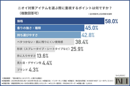 再び全員に、「ニオイ対策アイテム選定時の重視点」について尋ねたところ、『価格(58.0%)』が最多となり、『香りの強さ・種類(45.0%)』『持ち運びやすさ(42.8%)』が続きました。