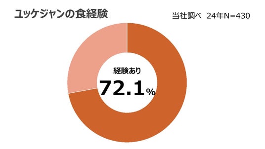 2024年度のユッケジャン調味料市場は2020年度と比べ、153.9%と伸長しており(KSP-POS 全店千人金額(全国)20年度・24年度 9-2月)、メニューの食経験としても72.1%(当社調べ 24年 N=430)であり、日本の食卓に定着してきています。