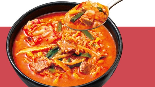 牛肉を中心にもやしなど様々な野菜を加え、唐辛子とにんにくを効かせて煮込んだ真っ赤な辛いテイストのスープです。