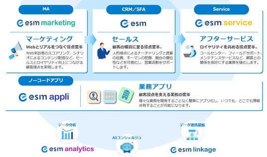 高機能なCRM/SFA「esm(eセールスマネージャー)」を中核に、MA(マーケティングオートメーション)ツールの「esm marketing」、アフターサービス向けマネジメントツール「esm service」の導入実績から得られた顧客接点プロセスマネジメントの実践的なノウハウを持っています。それらを組み合わせた課題解決ソリューションをご提供し、お客様の生産性の最大化に貢献できる取り組みを続けています。