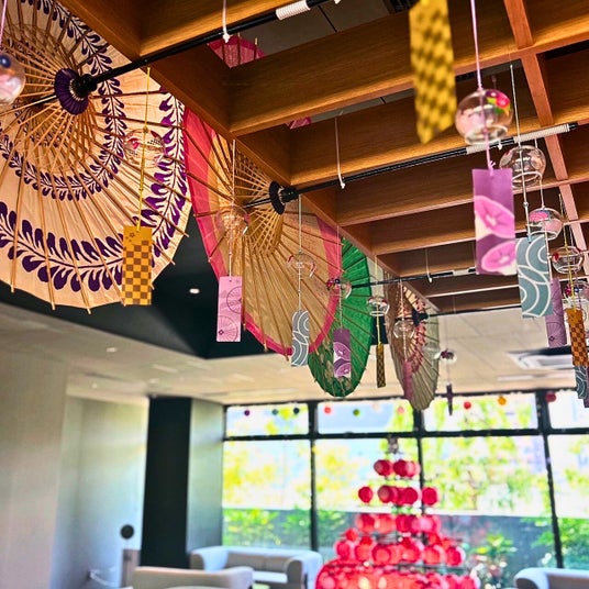 涼しげな和傘が彩る、夏の館内