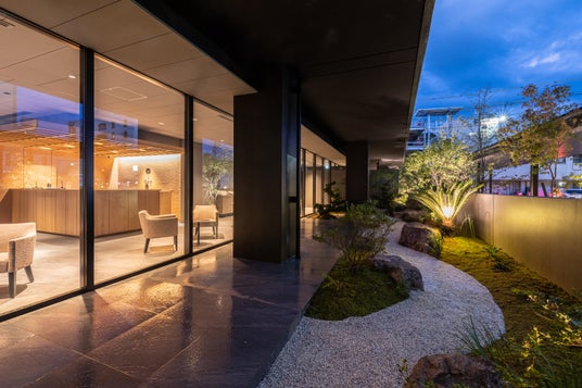 成瀬猪熊建築設計事務所が手掛けた和モダン空間。モノトーンのロビーに木の温もりを加え、無駄を削ぎ落とした洗練デザインが特徴