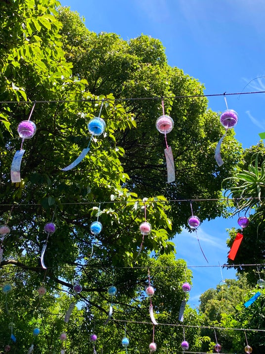 あじさいロードには今年も「幸せを呼ぶカラフル風鈴」が登場。目にも耳にも涼やかな癒しスポットです