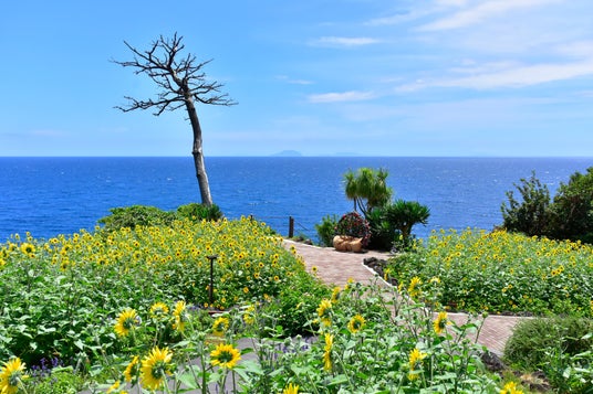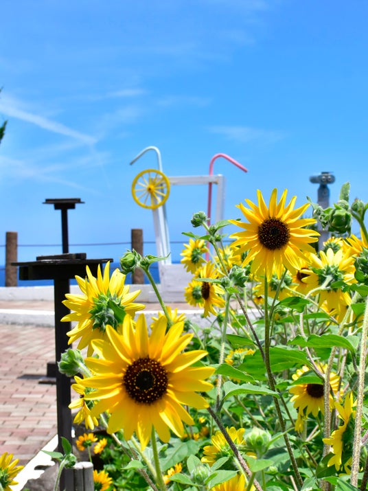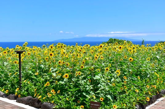 絶景を望む花畑では青い海とヒマワリの黄色い花が見事なコントラストに