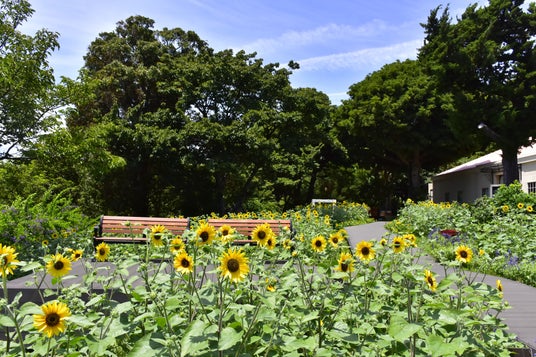 当園のヒマワリは、伊豆大島や城ヶ崎海岸、門脇灯台などの絶景を望む岬付近の花壇に約1,100株を植栽しております。この内約1,000株が「サンフィニティ」という品種で、茎が分岐して次から次へと開花する多花性の性質を持っており、1株に50~100輪の花が咲くため長く楽しむことができます。
