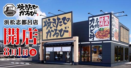 株式会社物語コーポレーション(本社:愛知県豊橋市/代表取締役社長:加藤 央之)は、熟成肉を使用した「焼きたてのカルビ丼」と「ユッケジャンスープ」の専門店『焼きたてのかるび』32店舗目を、2025年8月1日(金)に静岡県浜松市にオープンいたします。