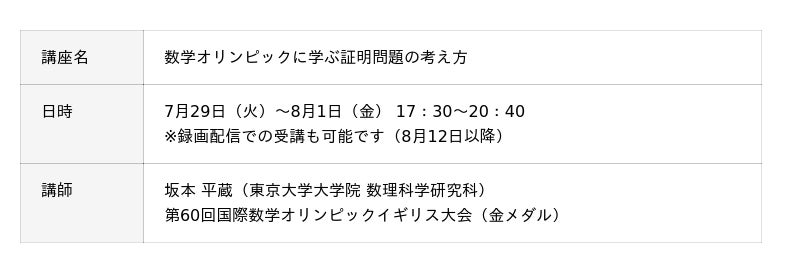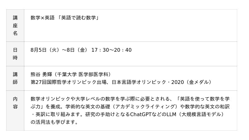 日本の研究力低下が報じられるなか、数学やサイエンスが大好きで、将来の研究者や各分野のトップランナーを志す中高生の知的好奇心を刺激する場として、本夏期講習をぜひご紹介ください。授業の取材も歓迎します。