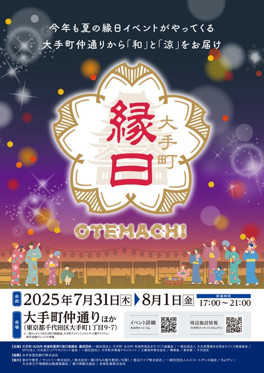 「大手町縁日 2025」は、大手町エリア活性化を目的に 2016 年の初開催から今回で 9 回目を迎えます。オフィス街が “子どもも大人も楽しめる縁日”に変身し、家族そろって東京の中心で夏祭りをお楽しみいただけます。