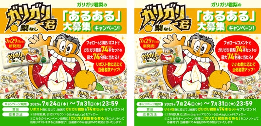夏の大人気商品「ガリガリ君梨」の美味しさを楽しんでいただく企画として、「ガリガリ君梨あるある」をコメントすると「ガリガリ君梨74本を最大74名様(最大5,476本)をプレゼント」するキャンペーンを赤城乳業公式X、Instagramで実施いたします。