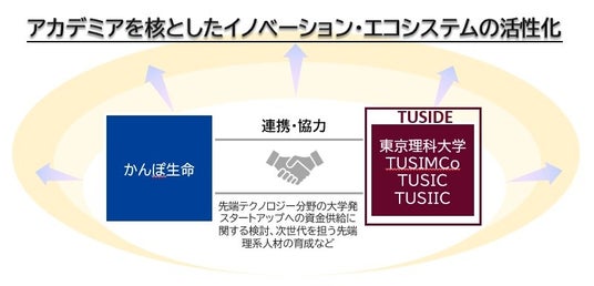 学校法人東京理科大学(東京都新宿区、理事長 浜本隆之、以下「東京理科大学」)が推進している「Tokyo University of Science Innovation Driven Ecosystem」(以下、「TUSIDE」)と株式会社かんぽ生命保険(東京都千代田区、取締役兼代表執行役社長 谷垣邦夫、以下「かんぽ生命」)は、アカデミアを核としたイノベーション・エコシステム(※1)活性化に向けた連携・協力を推進するため、2025年6月30日に協定を締結いたしました。