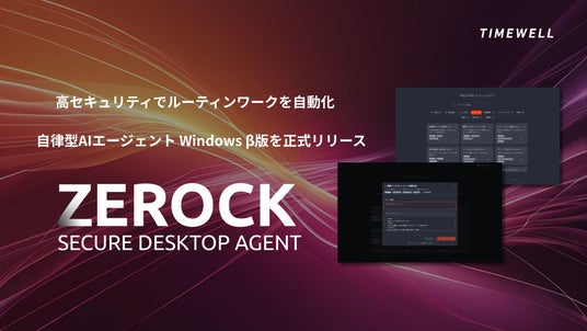 株式会社TIMEWELL(本社:神奈川県横浜市、代表取締役:濱本隆太、以下「TIMEWELL」)は、国内初(*1)のデスクトップ型で高セキュリティなAIエージェント「ZEROCK(ゼロック)」のWindows β版をリリースしました。事前のウェイティングリスト公開で、個人ユーザー200名超・法人10社超 に事前登録いただきました。
