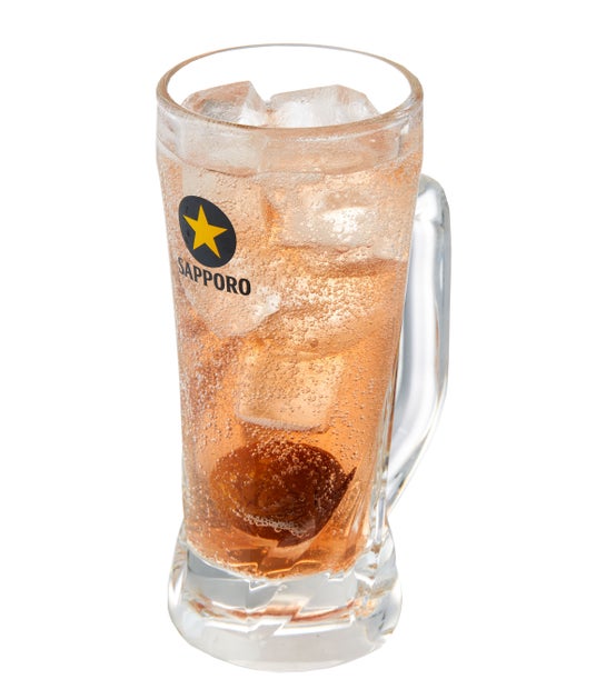 男梅サワー<梅落とし>:540円(税込594円)豊かな梅の風味と溢れる果実感。梅をつぶす前に一口。梅をつぶして味変もたのしい1杯です。
