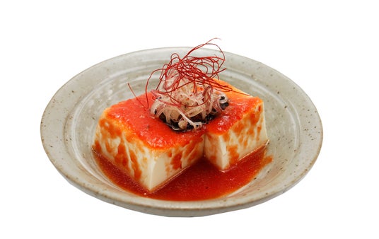 ひんやりトマトソースの冷奴:320円(税込352円)お出汁の効いたトマトソースの冷奴。韓国のりとミョウガの薬味、唐辛子がアクセント。