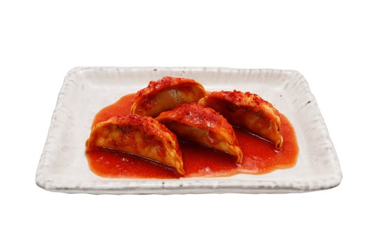 辛そうだけど辛くない!真っ赤なソースの揚餃子:340円(税込374円)カリっと揚げた餃子にイタリアンなトマトソース。餃子のカリっとした食感がお楽しみ。