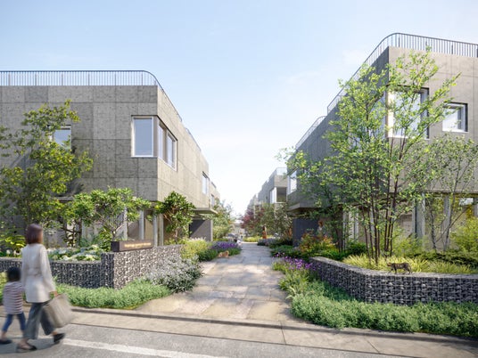 総戸数23戸・長屋形式を採用した本物件は、敷地中央に配した「こみち」を通りながら住戸へアクセスする配棟とし、こみち沿いには井戸のある半屋外の屋根付き空間、季節ごとに豊かな表情をみせる植栽と入居者が収穫可能な果樹を計画するなど、自然を通じて人々のつながりを育む仕掛けを施しました。