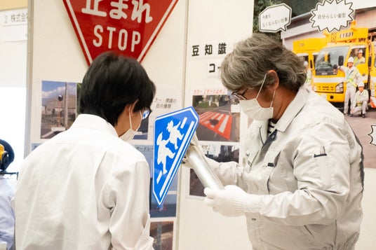 製造業・道路標識の看板を手に取って説明を受ける様子