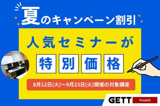 株式会社VOST(所在地:東京都江東区、代表者:別所智広)の教育プラットフォームGETT Proskillは、この度、「夏のキャンペーン割引」として8月12日(火)~9月23日(火)開催の対象セミナーを特別価格でご提供いたします。