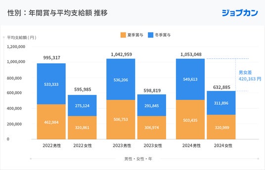 ・女性の年間賞与平均支給額は「632,885円」、男性の「1,053,048円」との差は「420,163円」、