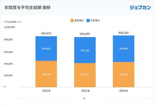・2024年の年間賞与平均支給額は「866,283円」、2023年比「3.2%」の増加