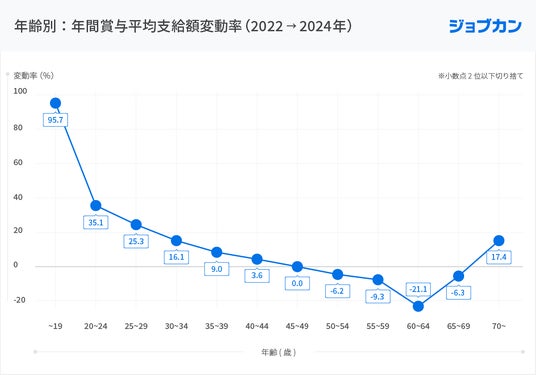 2022年から2024年にかけての変動率を年齢別に見ると「40~44歳」までは上昇傾向、「45~49歳」で停滞し、「50~69歳」の年代は下降傾向にあり、70歳以上は上昇傾向に戻ります。
