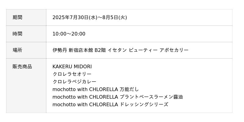 【伊勢丹 新宿店POP UP開催】7/30~8/5 筑後産クロレラを使ったプラントベース商品の期間限定イベント開催!試飲・試食&サンプル配布も