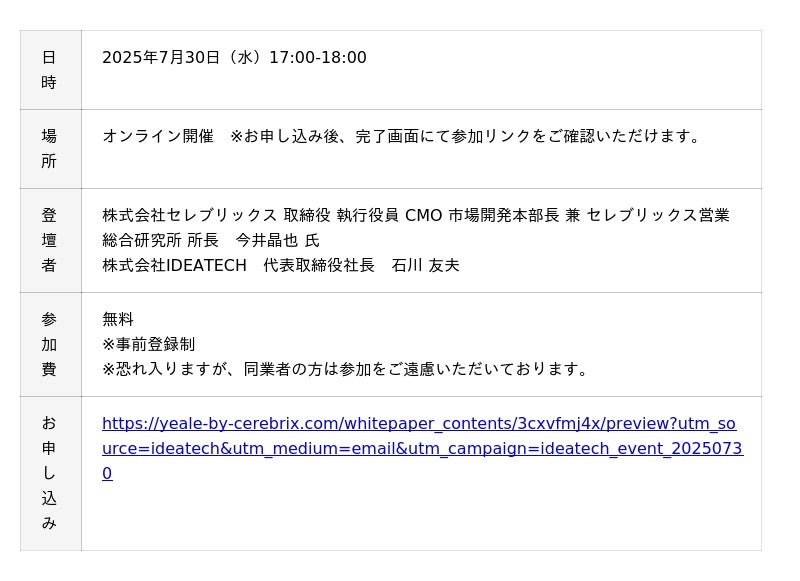 ファクトに基づいたコンテンツ開発とマーケティング支援を行う、株式会社IDEATECH(本社:東京都港区、代表取締役社長:石川友夫、以下 IDEATECH)は、株式会社セレブリックス(本社:東京都江東区、代表取締役社長:北川 和毅)と共同で、2025年7月30日(水)17:00-18:00に「独自調査データから紐解く|大型商談を勝ち取るセールスコンテンツ活用術」と題するオンラインセミナーを開催いたしますので、お知らせいたします。