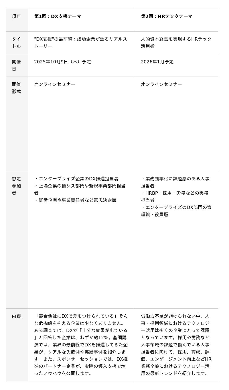 メディア事業を展開するログミー株式会社(本社:東京都渋谷区、代表取締役社長:三浦由加里)が運営する「ログミーBusiness」は、旬のビジネステーマに沿って開催する新たなオンラインセミナーシリーズ「ログミーBusiness Future Talks」を立ち上げることを発表いたします。第1回として2025年10月に「"DX支援"の最前線:成功企業が語るリアルストーリー」、第2回として2026年1月に「人的資本経営を実現するHRテック活用術」の開催を予定しており、現在各回のスポンサー企業を募集しています。
