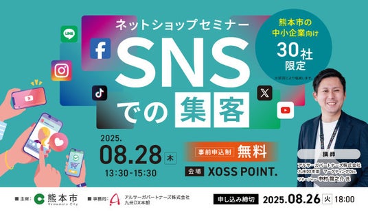 企業のDXを促進するアルサーガパートナーズ株式会社(本社:東京都渋谷区、代表取締役社長 CEO/CTO:小俣泰明、以下「アルサーガパートナーズ」)は、8月28日(木)13:30~15:30に開催される、熊本市主催の「ネットショップセミナー “SNS集客”」において、弊社マーケティングDiv. マネージャー中村が登壇することをお知らせいたします。