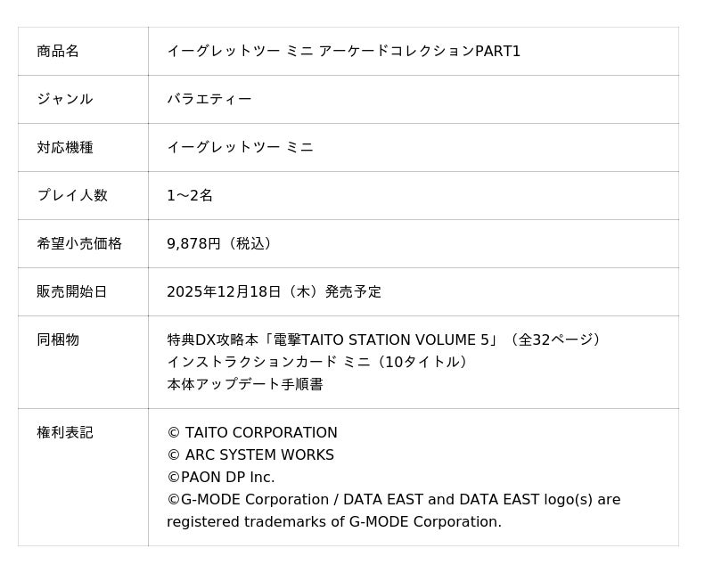 全10タイトルを収録した『イーグレットツー ミニ』専用ソフト収録SDカードのほか、全32ページの特典DX攻略本「電撃TAITO STATION VOLUME 5」と全10タイトルの「インストラクションカード ミニ」が同梱されます。