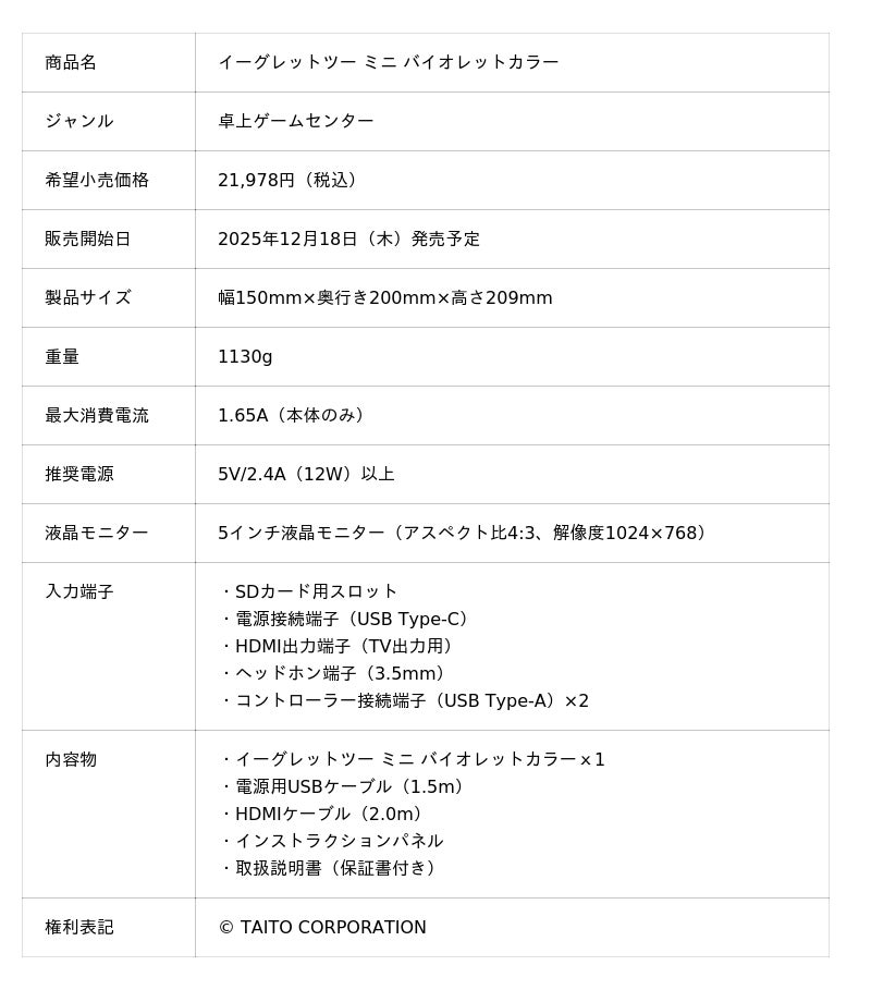 ※TAITO、TAITOロゴおよび「イーグレットツー ミニ(EGRETII mini)」は、日本およびその他の国における株式会社タイトーの商標または登録商標です。