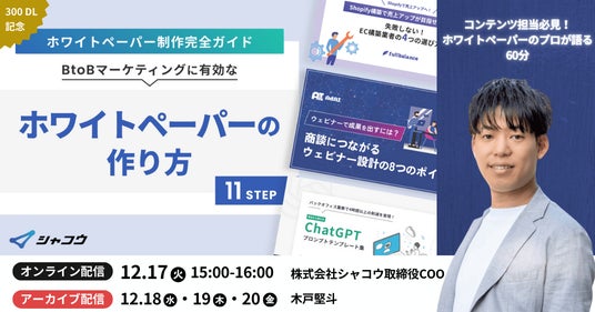 シャコウ社ではこれまで、BtoBマーケティング・ホワイトペーパー領域におけるメソッドの発信活動を積極的に行ってまいりました。特にホワイトペーパーマーケティングは、リード獲得・ナーチャリング施策全体の「企画・ディレクション」、ストーリーライティング・デザインの「制作実務」、商談獲得につなげる「インサイドセールス」とBtoBマーケティングの中でも複数にまたがる部署のシームレスな実務実行が求められる難易度の高い施策となっております。