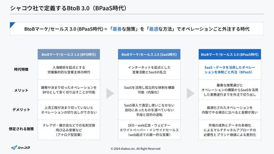 シャコウ社では、BtoBマーケティング・セールスの潮流が、労働集約的な営業主体のBtoB 1.0(BPO時代)からデータ活用・施策効率化を推進するSaaSが乱立するBtoB 2.0(SaaS時代)へ、そして「最善な施策」を「最適な方法」でオペレーションごと切り出すBtoB 3.0(BPaaS時代)と移り変っていると考えています。