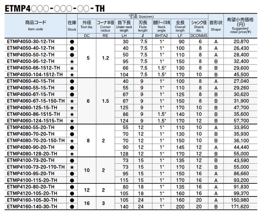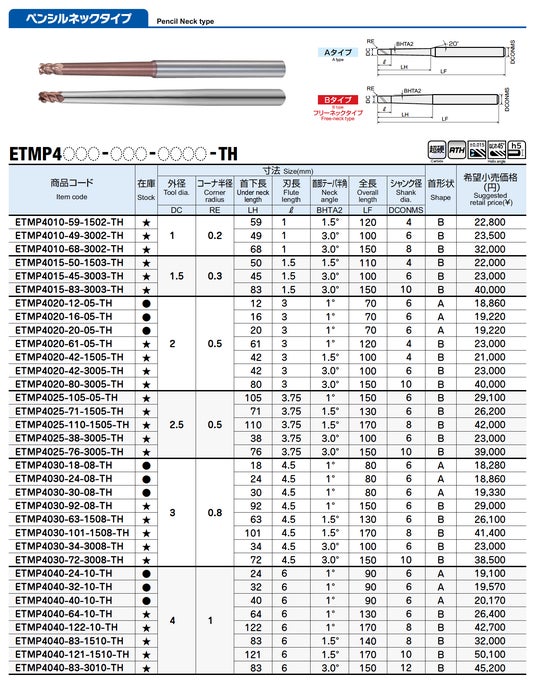 そこでこのたび弊社は、高能率荒加工で定評のあるエポックターボミルペンシルネック(ETMP-TH)のフリーネックタイプを追加し発売いたします。また、先行発売した刃先交換式工具用のモジュラーミル専用超硬シャンクと併せ、大型金型に対するトータルソリューションへの対応を加速させていく所存です。
