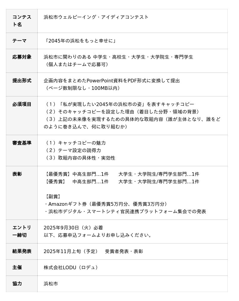 株式会社LODU(石川県野々市市、代表:島田高行)は浜松市の協力のもと、地域幸福度向上を目指す若者向けコンテスト「浜松市ウェルビーイング・アイディアコンテスト」を開催いたします。