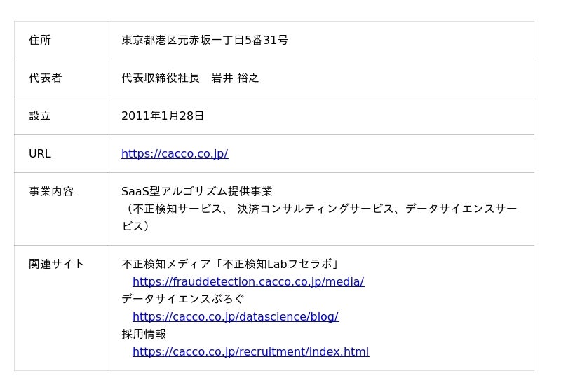 Caccoは、「未来のゲームチェンジャーの『まずやってみよう』をカタチに」という経営ビジョンを掲げ、セキュリティ・ペイメント・データサイエンス技術をもとに、アルゴリズム及びソフトウエアを開発・提供し企業の課題解決やチャレンジを支援することを目指しております。 オンライン取引における「不正検知サービス」を中核サービスとして位置づけ、不正会員登録/不正ログインから不正注文対策まで対応可能な国内での導入実績数No.1の不正検知サービス「O-PLUX」や金融機関や会員サイトにおける情報漏洩対策の不正ログイン検知サービス「O-MOTION」、フィッシング対策サービス等を提供しております。