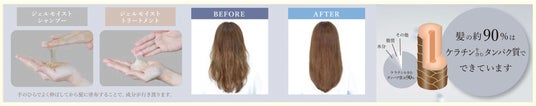 最大の特長は、独自開発『活性ケラチンリポソーム※2』を配合した、新感覚の「密着ジェルセラム処方」。美容液のようなジェルが髪1本1本に密着し、補修成分を深層※4まで効率的に浸透。うねりの根本※4にアプローチし、分子レベル※5から整えられた、うるおいとハリに満ちた扱いやすい髪へと導きます。