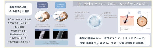「ケラチン」の中でも特に補修効果の高い「活性ケラチン* 」を、ナノサイズのカプセル「リポソーム」に内包した独自成分を配合。ジェル処方と組み合わせることで、成分が髪に長く留まり、深層まで※4 効率的に浸透します。