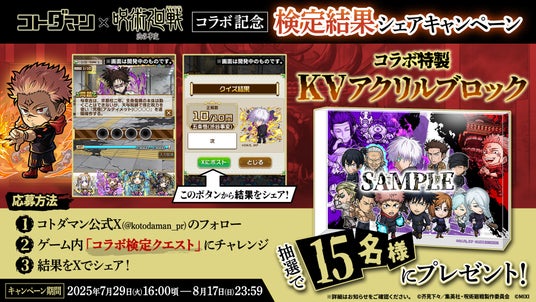 「コラボ召喚コトダマンセット」「コラボ特製フレークシール(15種セット)」「コラボ特製KVアクリルブロック」が抽選で当たるXキャンペーンを開催します。