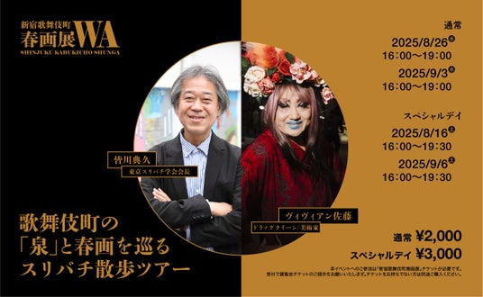 8月6日(水)、8月16日(土)、9月6日(土)は、ゲストにドラァグクイーンのヴィヴィアン佐藤が美人アシスタントとして一緒にお散歩。さらに、土曜日の回は皆川のミニレクチャーのあとに、ヴィヴィアン佐藤によるミニトークが付いたスペシャルデイとなる。スリバチ散歩を通じて、歌舞伎町と春画を全身で楽しんでほしい。