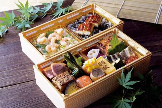 夏が旬の食材を二段に凝縮した贅沢なお弁当 ミニ鰻丼と芝海老の天ばらを配したお食事を愉しめる下段と、旬の焼き魚に鶏の塩麹焼き、鴨ロースといったお肉料理、夏野菜をふんだんに使った旬が詰まった上段で構成された「納涼弁当(3,500円・税込)」。