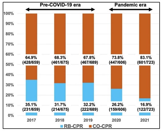 国立大学法人岡山大学(本部:岡山市北区、学長:那須保友)学術研究院医歯薬学域(医)地域救急・災害医療学講座の小原隆史講師(特任)、同学域救命救急・災害医学の内藤宏道准教授、中尾篤典教授、および学術研究院医療開発領域(岡山大学病院)高度救命救急センターの塚原紘平講師(小児救急科長)らの研究グループは、学術研究院医歯薬学域(医)疫学・衛生学分野の松本尚美助教、賴藤貴志教授らと共同で「All-Japan Utstein Registry」(総務省消防庁)を用いて、コロナ流行前(2017-2019)とコロナ禍(2020-2021)の期間において、小児の院外心停止患者に対する目撃者による蘇生法の変化が、死亡などの転帰に与えた影響を調査しました。