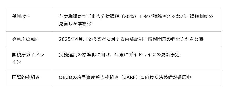 2025年は、税制・規制・国際連携の各面で、暗号資産に関する税務環境が大きく動く年と位置づけられています。