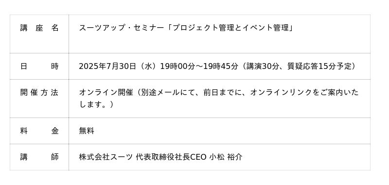 当社では、2025年7月30日(水)19時から、当社代表の小松が講師を務めるスーツアップ・セミナー「プロジェクト管理とイベント管理」を無料開催します。