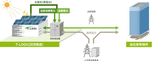 本物件では、他の「T-LOGI」 シリーズと同様に、屋上に設置した太陽光パネルにより発電された電力を商用電力と併せて施設内で自家消費する予定です。また、本物件内で消費しきれない余剰電力については、仙台市内で東京建物が所有するオフィスビルに送電することにより、再生可能エネルギーを余すことなく活用します。本物件はこうした自家発電・自家消費の仕組み等により、環境に配慮した施設の証である「BELS」※2最高ランクである『ZEB』認証※3を取得予定です。