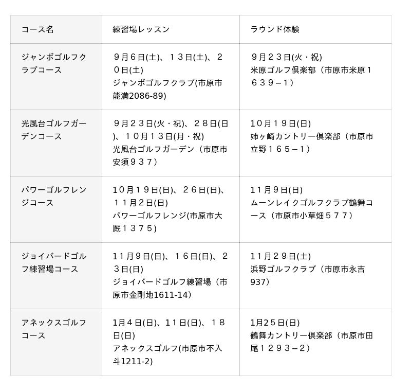 - ゴルフ練習場で、参加者のレベルに応じた個別レッスン(3回)- ゴルフ場本コースで、4~6ホール程度のラウンド体験(1回)