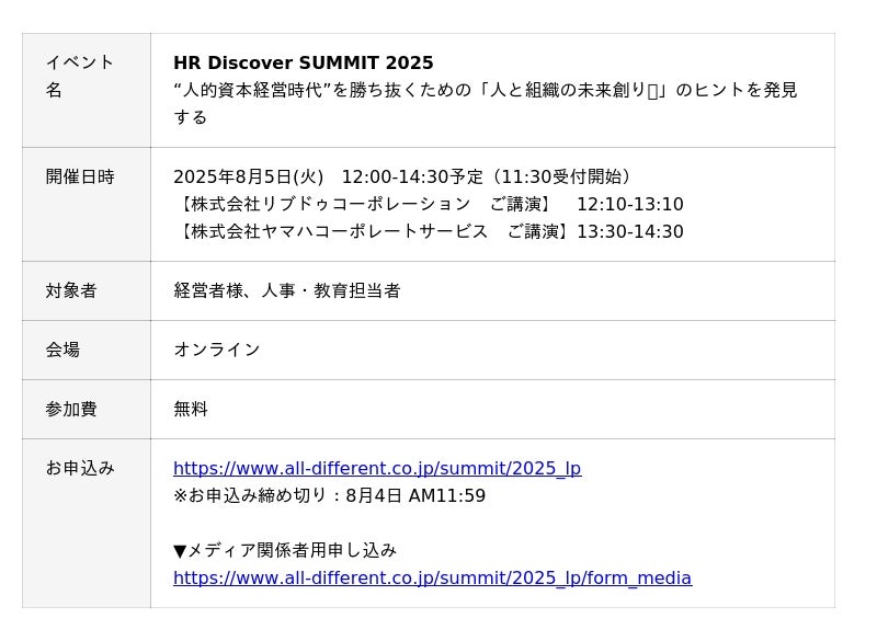 累計20,000社450万人以上の組織開発・人材育成を支援するALL DIFFERENT(オールディファレント)株式会社(所在地:東京都千代田区 代表取締役社長:眞崎大輔)は、2025年8月5日(火)に経営者・人事向けの無料オンラインイベント「HR Discover SUMMIT 2025」を開催します。「“人的資本経営時代”を勝ち抜くための『人と組織の未来創り(R)』のヒントを発見する」をテーマに、組織開発・人材育成で優れた取り組みをされている企業の人事責任者にご講演いただきます。(イベント詳細ページ:https://www.all-different.co.jp/summit/2025_lp)