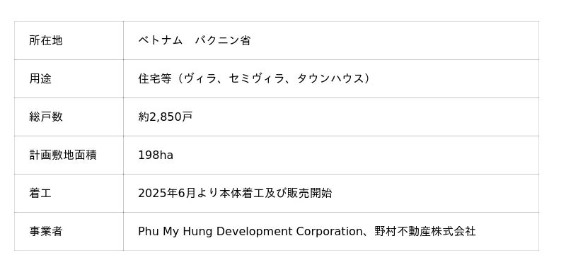 野村不動産株式会社(東京都新宿区/代表取締役社長:松尾大作、以下「当社」)は、現地大手不動産デベロッパーであるPhu My Hung Development Corporation(以下「フーミーフン社」)と共同で、ベトナム有数のハイテク産業の集積地であるハノイ隣接のバクニン省において、「Hong Hac City プロジェクト(以下「本タウンシップ」)」を開始します。